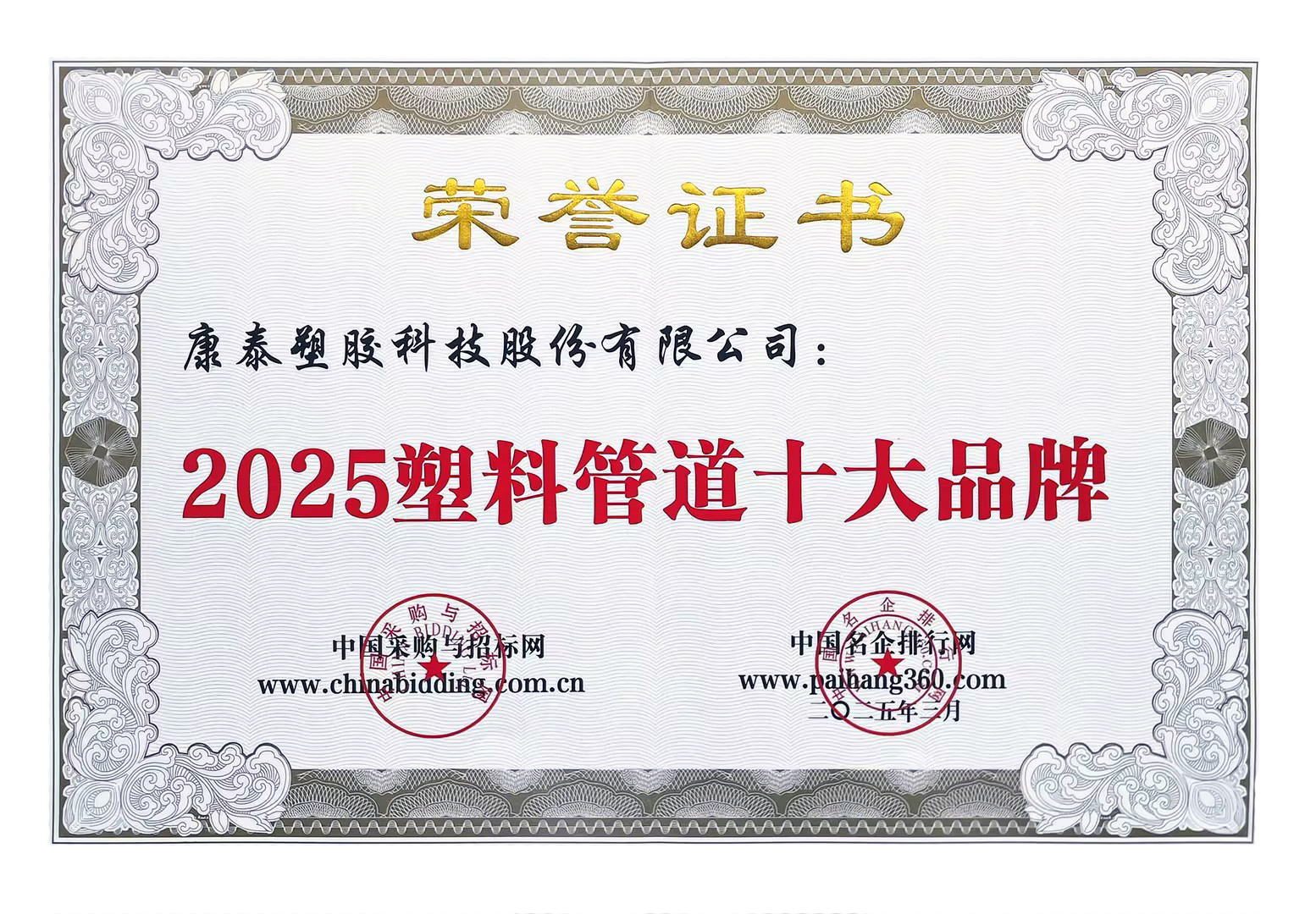 康泰集團(tuán)榮獲“2025塑料管道十大品牌”、“2025家裝管道十大品牌”等稱號(hào)2025/03/24 2741日前,在中國采購與招標(biāo)網(wǎng)、中國名企排行網(wǎng)聯(lián)合主辦的中國塑料管道評價(jià)活動(dòng)...read more