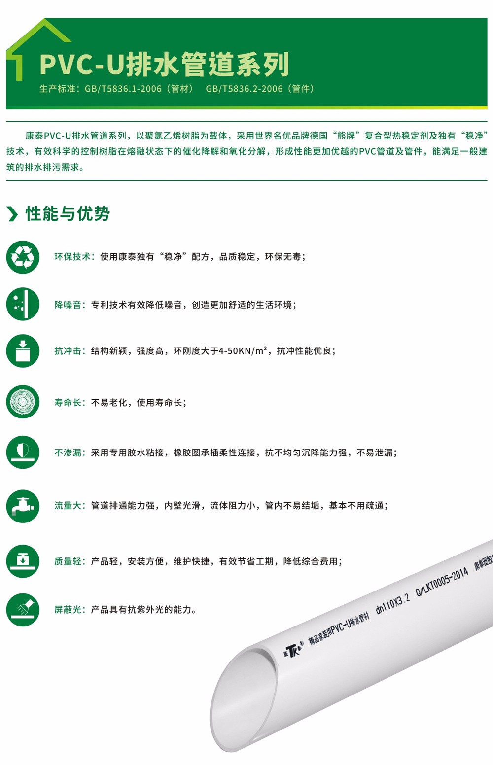 康泰PVC-U排水管道系列,以聚氯乙烯樹脂為載體,采用世界名優(yōu)品牌德國“熊牌”復(fù)合型熱穩(wěn)定劑及獨有“穩(wěn)凈”技術(shù),有效科學(xué)的控制樹脂在熔融狀態(tài)下的催化降解和氧化分解,形成性能更加優(yōu)越的PVC管道及管件,能滿足一般建筑的排水排污需求。
