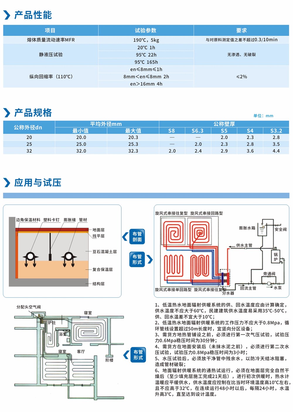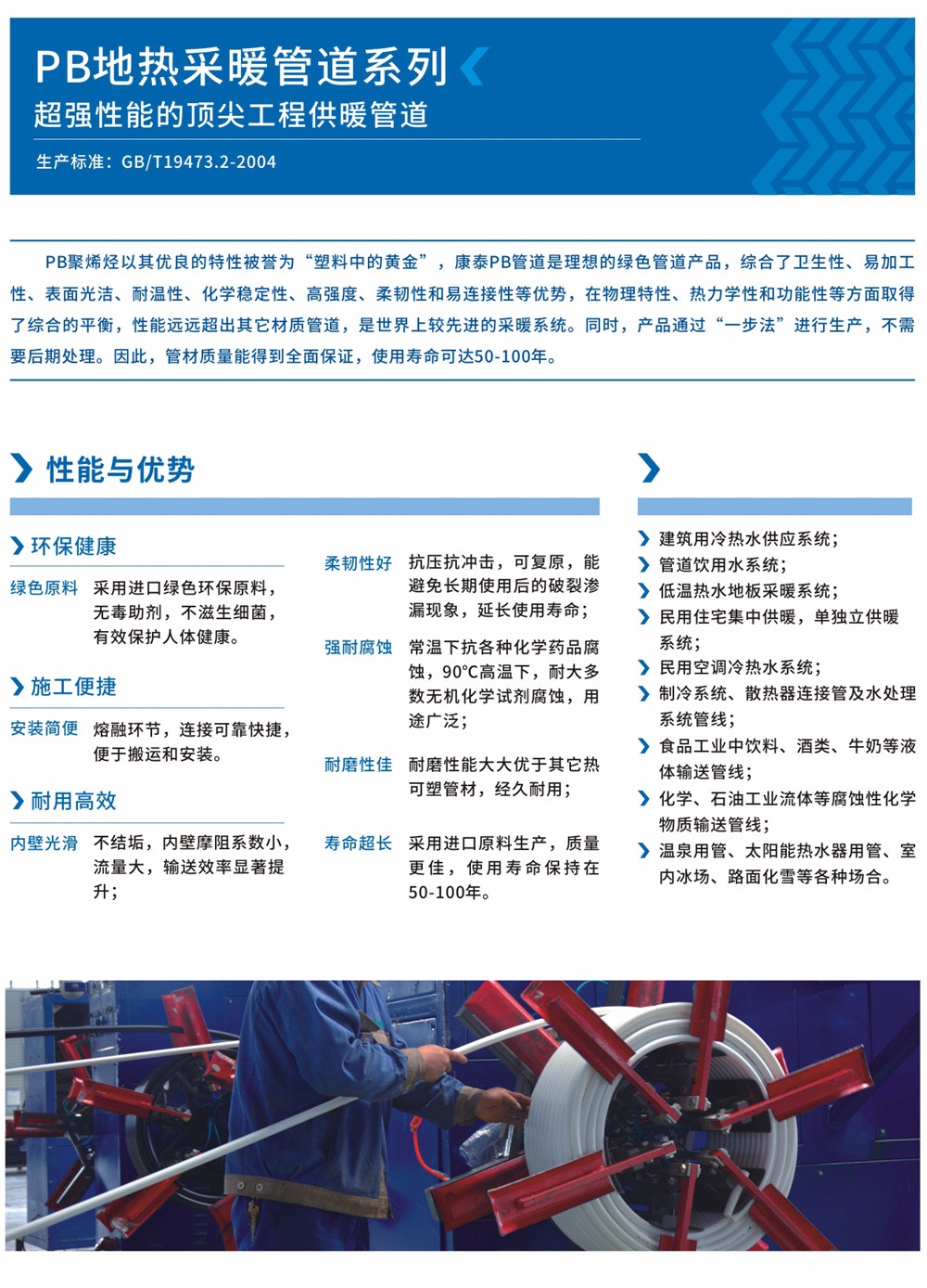 從結(jié)構(gòu)上來看,聚丁烯(PB) 是一種線性的半結(jié)晶性熱塑性材料,是一種高分子惰性聚合物,是世界上最先進的化學(xué)材料之一。加工和使用過程中無毒無污染,可以反復(fù)加熱成型。聚丁烯(PB)綜合了衛(wèi)生性、加工性、表面光潔度、耐溫性、化學(xué)穩(wěn)定性、強度、柔韌性和易連接性等優(yōu)勢,在物理特性、熱力學(xué)特性和功能性等方面取得了綜合的平衡,從而賦予了PB地?zé)岵膳芄懿闹T多得天獨厚的特質(zhì),能夠用于流體輸送系統(tǒng),尤其在建筑內(nèi)的熱水輸送系統(tǒng)領(lǐng)域開辟了廣闊的用武之地,PB管道是世界上較先進的采暖系統(tǒng),他的優(yōu)良特性被越來越多的人關(guān)注,被譽為“塑料中的黃金”。 聚丁烯(PB)管材是目前較理想的地板采暖管材和冷熱水管材,其性能遠遠超出其它管材的,我公司生產(chǎn)的新型PB地板采暖管,采用PB專用料生產(chǎn),因此材質(zhì)是十分可靠的。PB管道的生產(chǎn),實現(xiàn)了真正的“一步法”,它不需要后期處理,因此,管材質(zhì)量能得到全面保證,使用壽命可達50年-100年。
