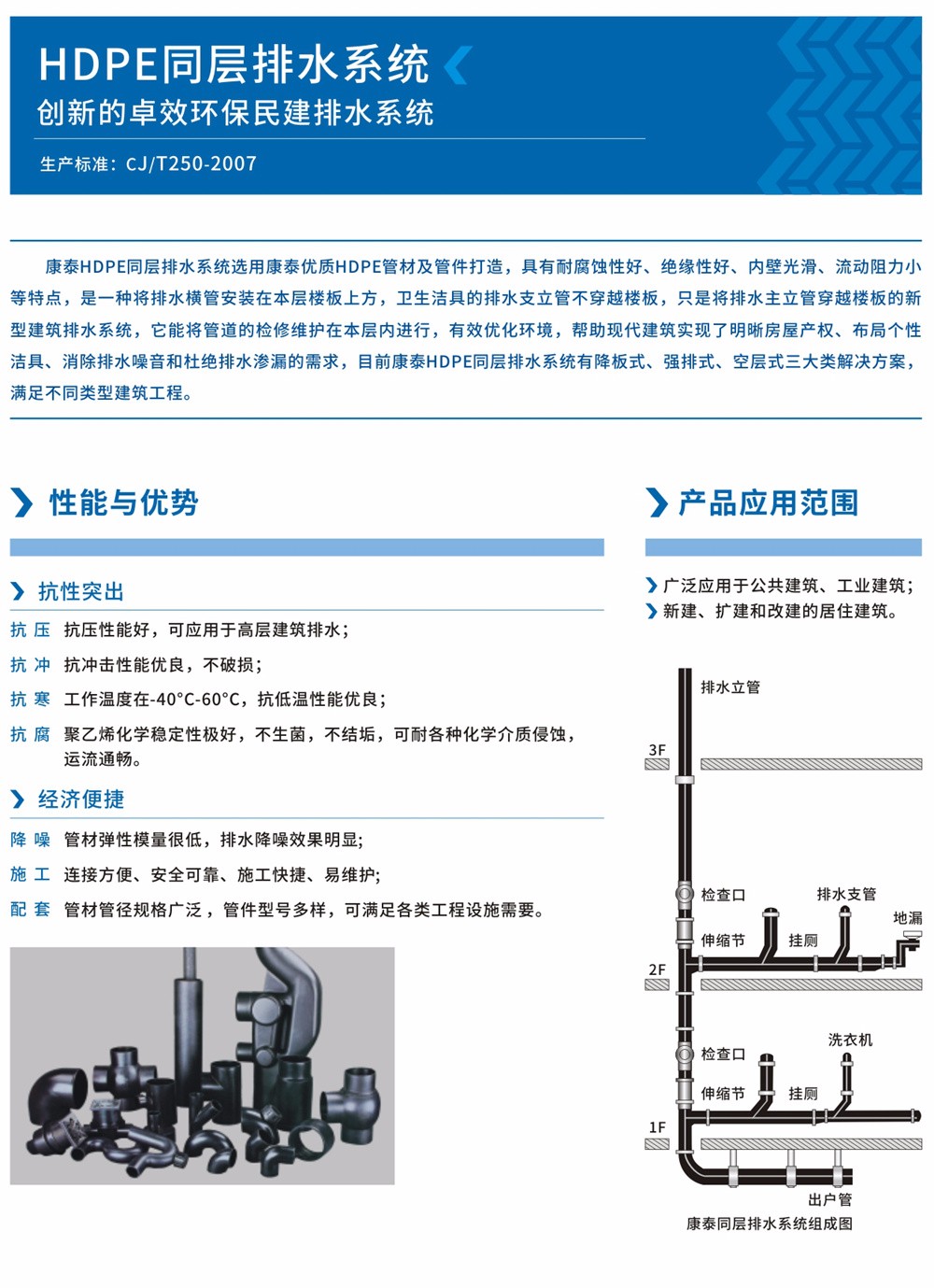 集團(tuán)研發(fā)的HDPE同城排水系列產(chǎn)品,選用選優(yōu)質(zhì)管材及管件打造,具有密度小、重量輕、韌性好、綠色環(huán)保、耐腐蝕、耐老化、絕緣性好、內(nèi)壁光滑、流動阻力小、安裝快捷方便等特點。根據(jù)目前各類用戶的不同條件的需求,康泰HDPE同層排水系統(tǒng)有三種安裝方案,分別是降板式、墻排式、墊層式,既降低了土建成本,增加了整體凈空高度;又達(dá)到了衛(wèi)生、美觀、整潔的要求。